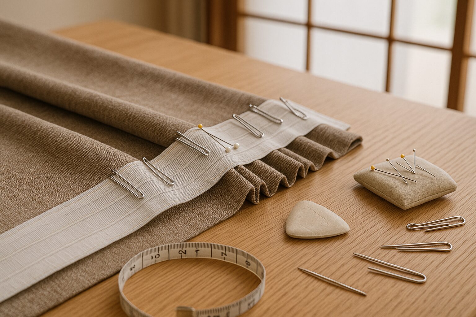 プリーツテープをアイロンで接着し、紐を引いてヒダを寄せる方法も手軽です。ミシンを使わずにヒダの形を固定できるため、初心者でも均等なドレープを作れます。ただし、強度を高めたい場合は部分的に縫い留めすると安心です。