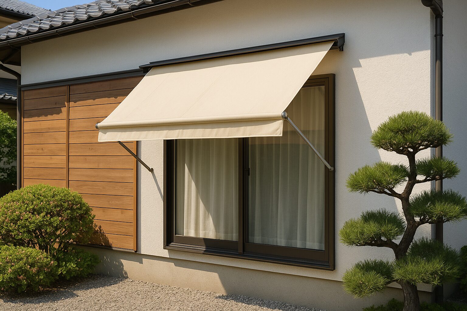 具体例:郊外の一戸建てでは、ベージュのオーニングと木製テーブルを組み合わせ、家族で食事を楽しめる屋外スペースを設置。日差しを防ぐだけでなく、庭の雰囲気づくりにも役立ちました。