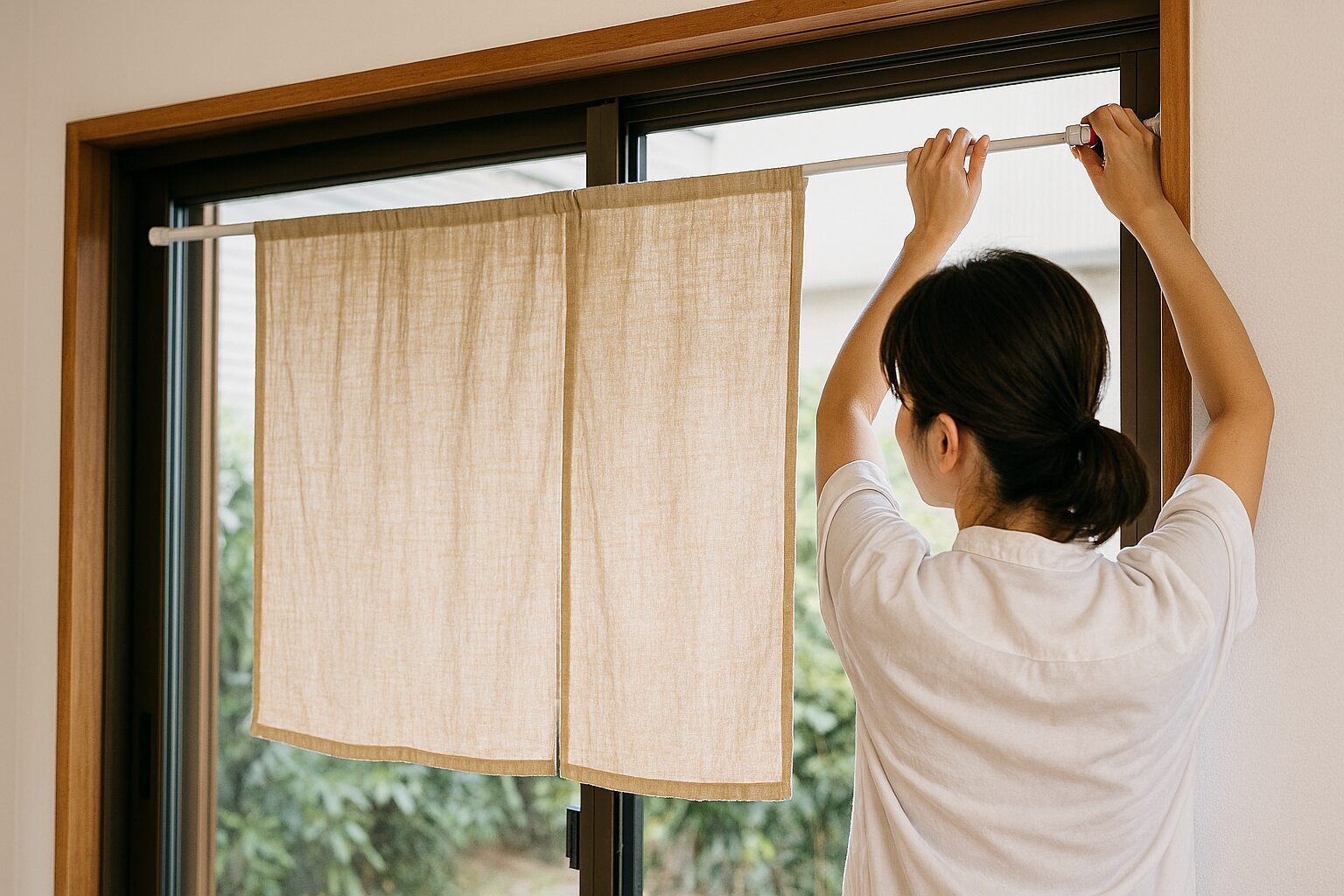 のれんを設置する際は、まず左右の高さが水平になるよう確認することが重要です。水平器やスマホアプリを活用すると正確に合わせられます。高さは用途に応じて調整し、玄関なら頭をぶつけない程度に、窓なら枠より数センチ上に設置するとバランスが良くなります。